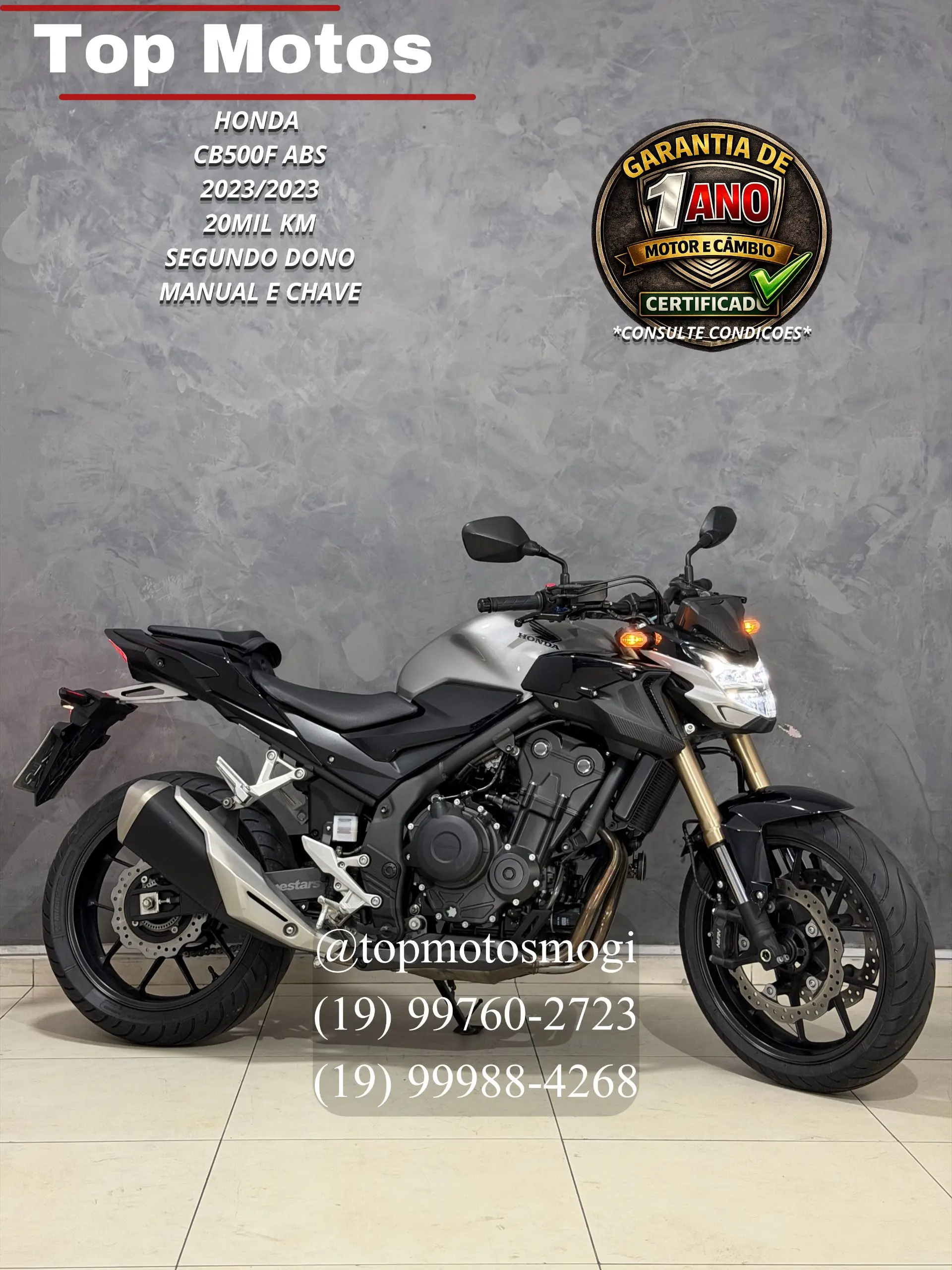 -20232023 -20mil km -segundo dono -sem detalhes -garantia motor e cambio de 1 ano consulte condicoes -pegamos sua moto de menormaior valor em negocio!!entre em contato para melhores informacoes. -financiamento em ate 48x -cartao de credito em ate 21xmediante cotacao, solicite uma simulacao sem compromisso!! vendedores @oliveiraotavio.35 19 99760-2723 @big.jhoo53 19 99988-4268 cb500f 2023 motor 471cc bicilindrico, equilibrado e com otima performance na cidade e estrada design naked esportivo, suspensao confortavel e iluminacao full led