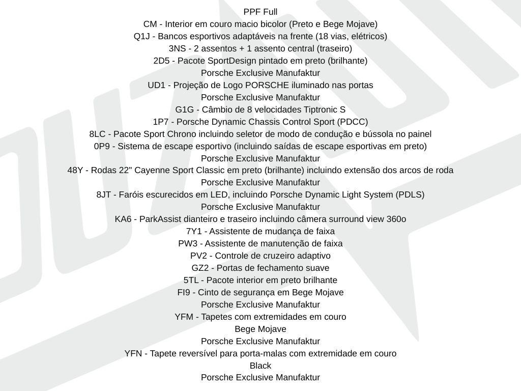 listagem de opcionais da ultima foto, ppf full! devido a alta rotatividade do nosso estoque, e necessario confirmar a disponibilidade previa do veiculo. nos reservamos o direito de corrigir eventuais erros de digitacao e informacao que possam ocorrer.