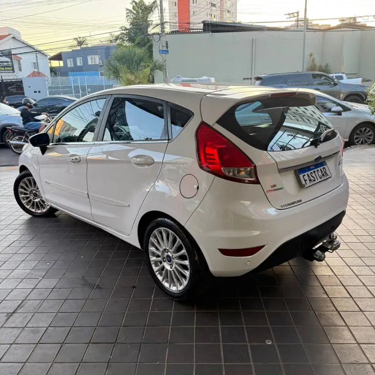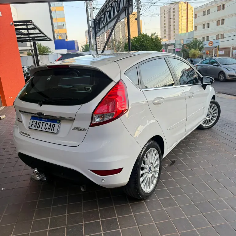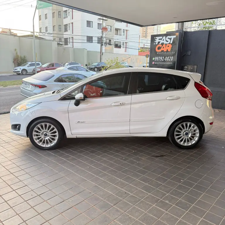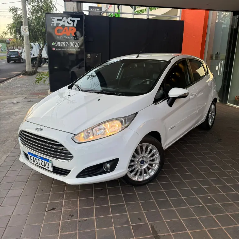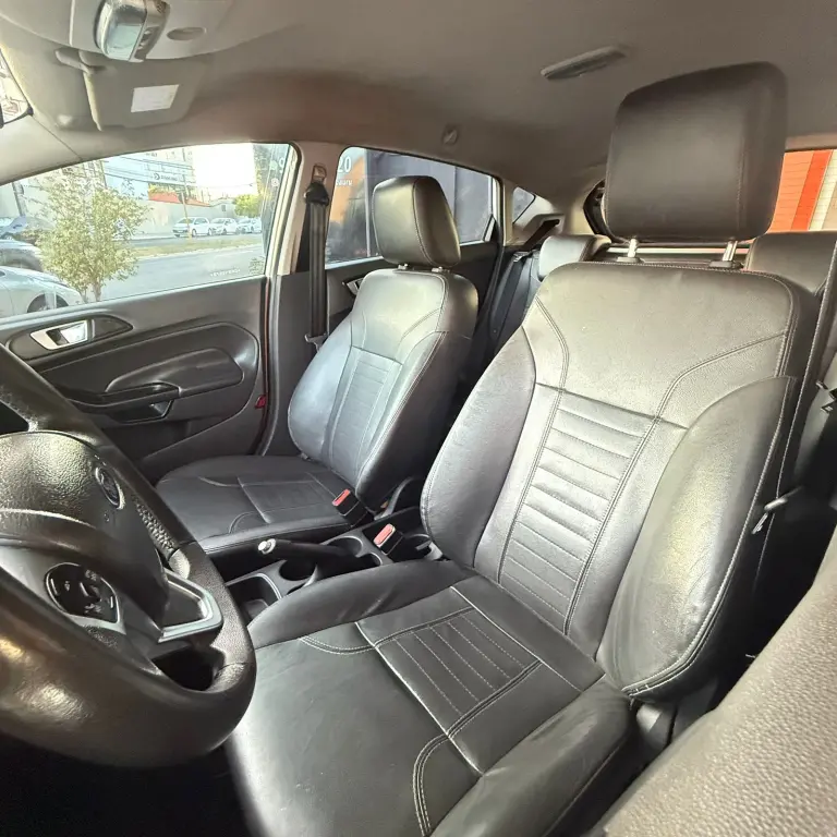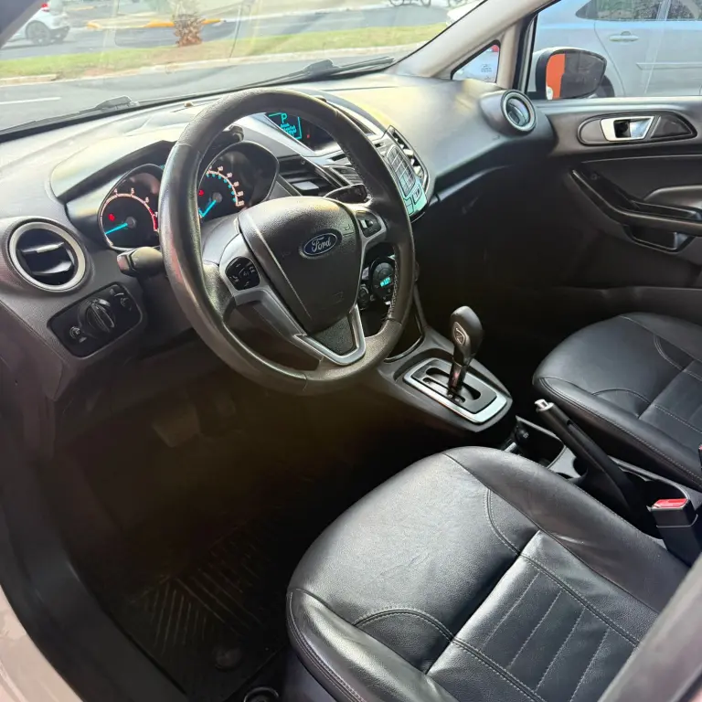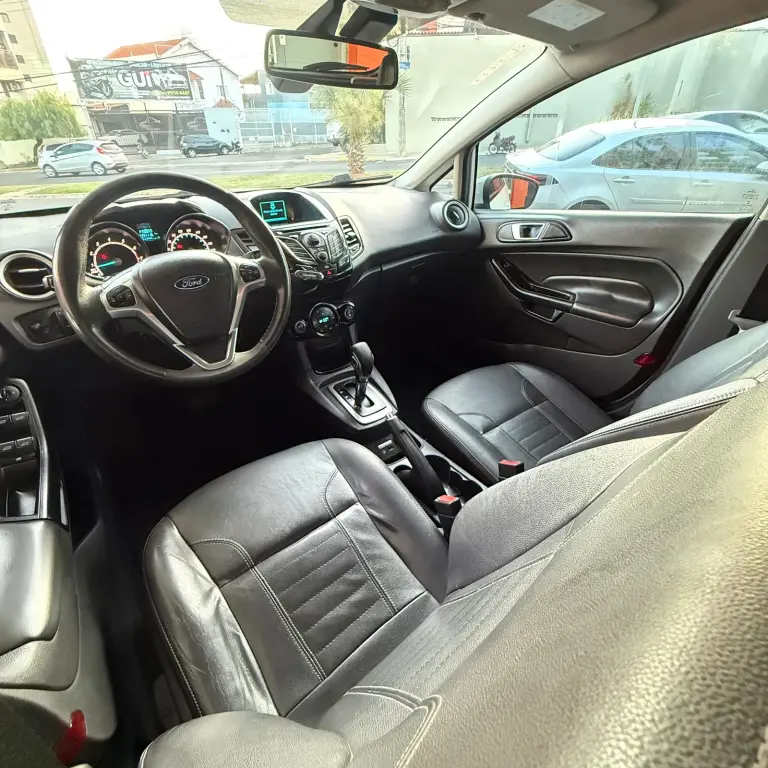 Ford New Fiesta Titanium • 2016 • Motor 1.6 Flex • Câmbio automático • Direção elétrica • Volante multifuncional • Ar condicionado • Vidros e travas elétricas • Bancos de couro • Som • Rodas de liga leve.