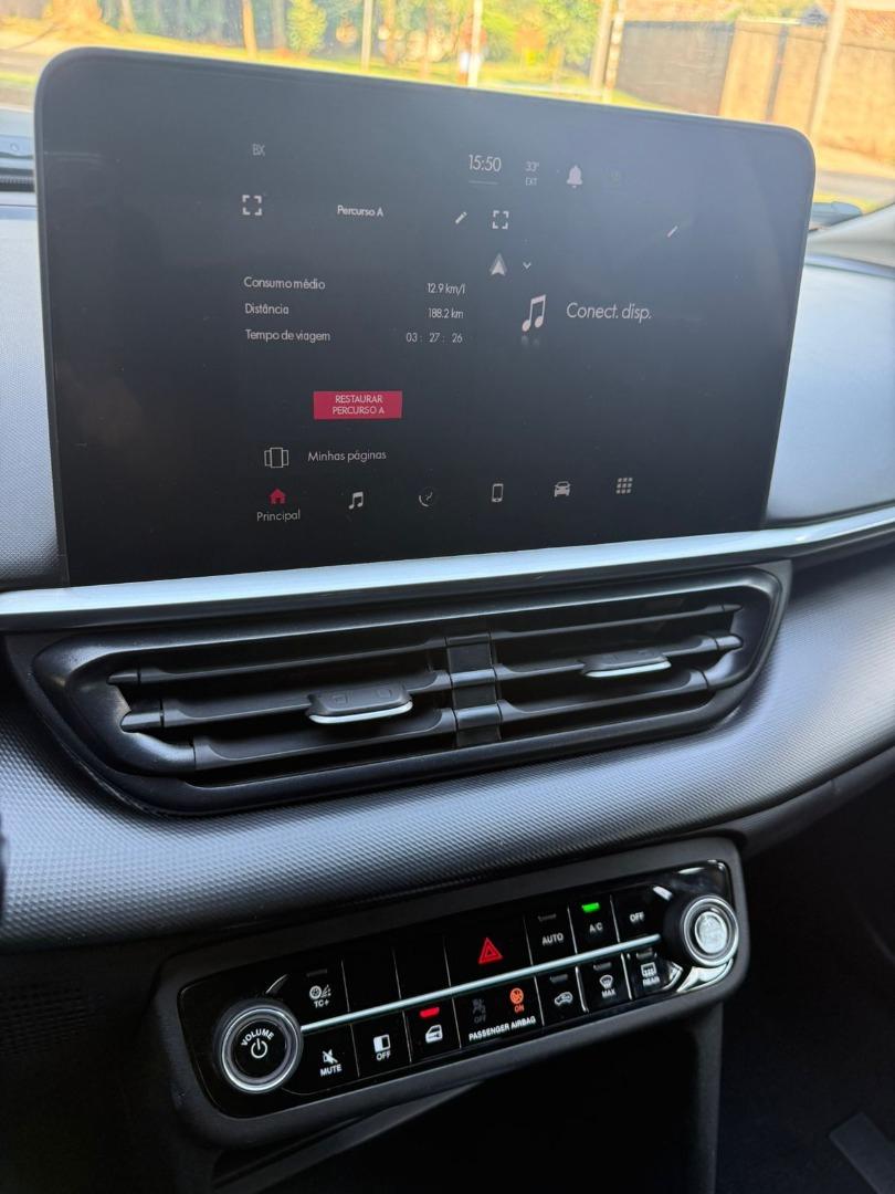 Central multimídia flutuante de 8,4" com Apple CarPlay e Android Auto sem fio, ar-condicionado automático digital de uma zona, computador de bordo com tela digital de 3,5" e direção elétrica.